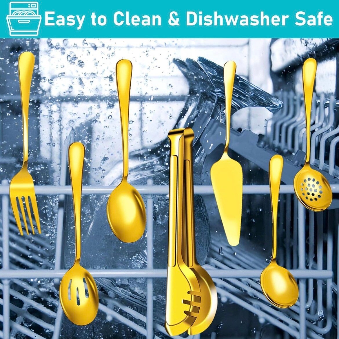 - 15-Piece Serving Utensils Set: Includes serving spoons, slotted spoons, forks, metal tongs, a soup ladle, cake server, and slotted ladle—ideal for everyday meals and special occasions.