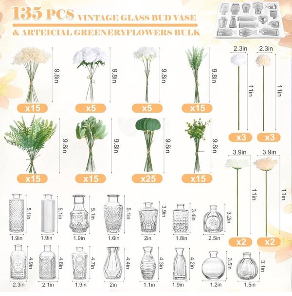 - Wedding Centerpiece Set: Includes 15 etched glass bud vases and 120 artificial plants to create beautiful table, wedding, or home décor displays.