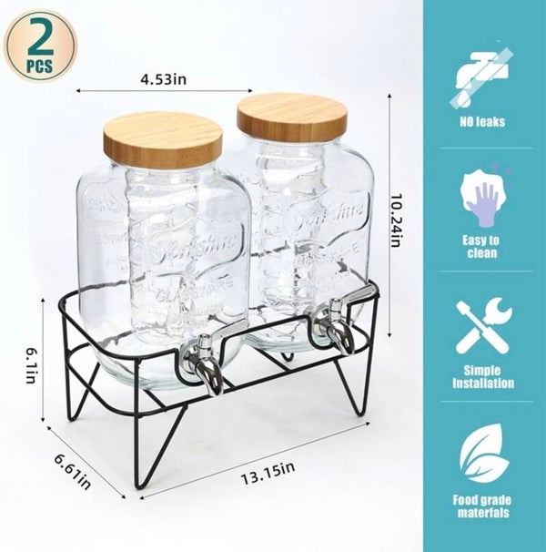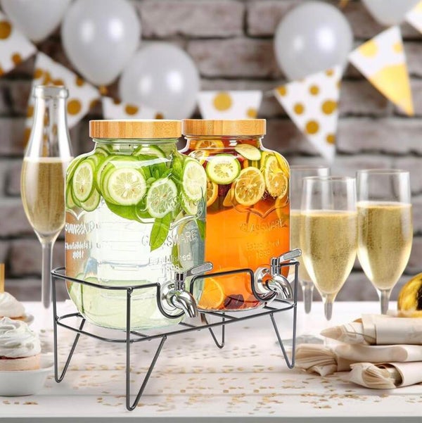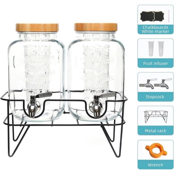 - What’s Included: 2 glass dispensers with bamboo lids, 2 fruit infusers, 2 stainless steel spigots, 1 metal stand, wooden tags, stickers, pen, wrench, and setup guide.